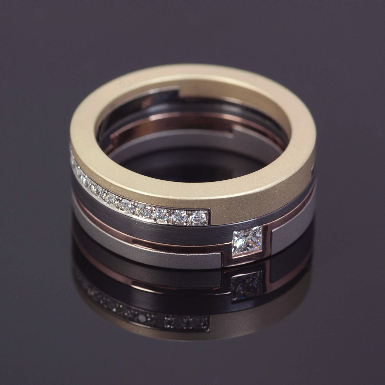 Als hommage aan Bauhaus oprichter Walter Gropius heeft Lange zijn designklassieker Ozephius in een nieuw jasje gestoken. De ring is uitgevoerd in titanium, zwart zirkonium en geel-, rood- en witgoud. Een princess geslepen diamant en een rij pavé gezette diamanten sieren de strakke creatie. Prijs € 3580,-.