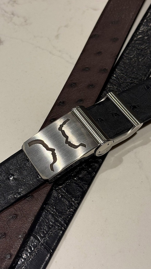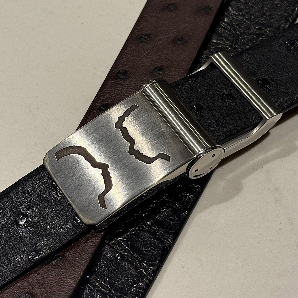 In zwart of donkerbruin en struisvogelleer kosten de riemen en gesp compleet 495 euro en met zwart alligatorleer 595 euro.