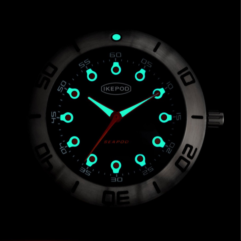 De Ikepod Seapod is ontworpen door Fabrice Gonet en is een perfecte design mix tussen (de Ikepod klassiekers) de Hemipode en Seaslug. De wijzerplaat is geïnspireerd door het eerste Ikepod horloge. Het automatische horloge is tot 200 meter waterdicht en heeft een draaibare duikring. Er kan worden gekozen uit een lichtblauwe of zwarte siliconenrubberen band en eventueel is (tegen een meerprijs is er eventueel een prachtige edelstalen band leverbaar). Het horloge heeft een schroefkroon, gewelfd saffierglas en een automatisch Miyota 9039 uurwerk. Het heeft een kastdiameter van 46 mm maar voelt eerder als 42 mm door het ontbreken van bandpoten. De details op de wijzerplaat en een aanduiding op de draairing zijn luminicerend en lichten op in het donker.
