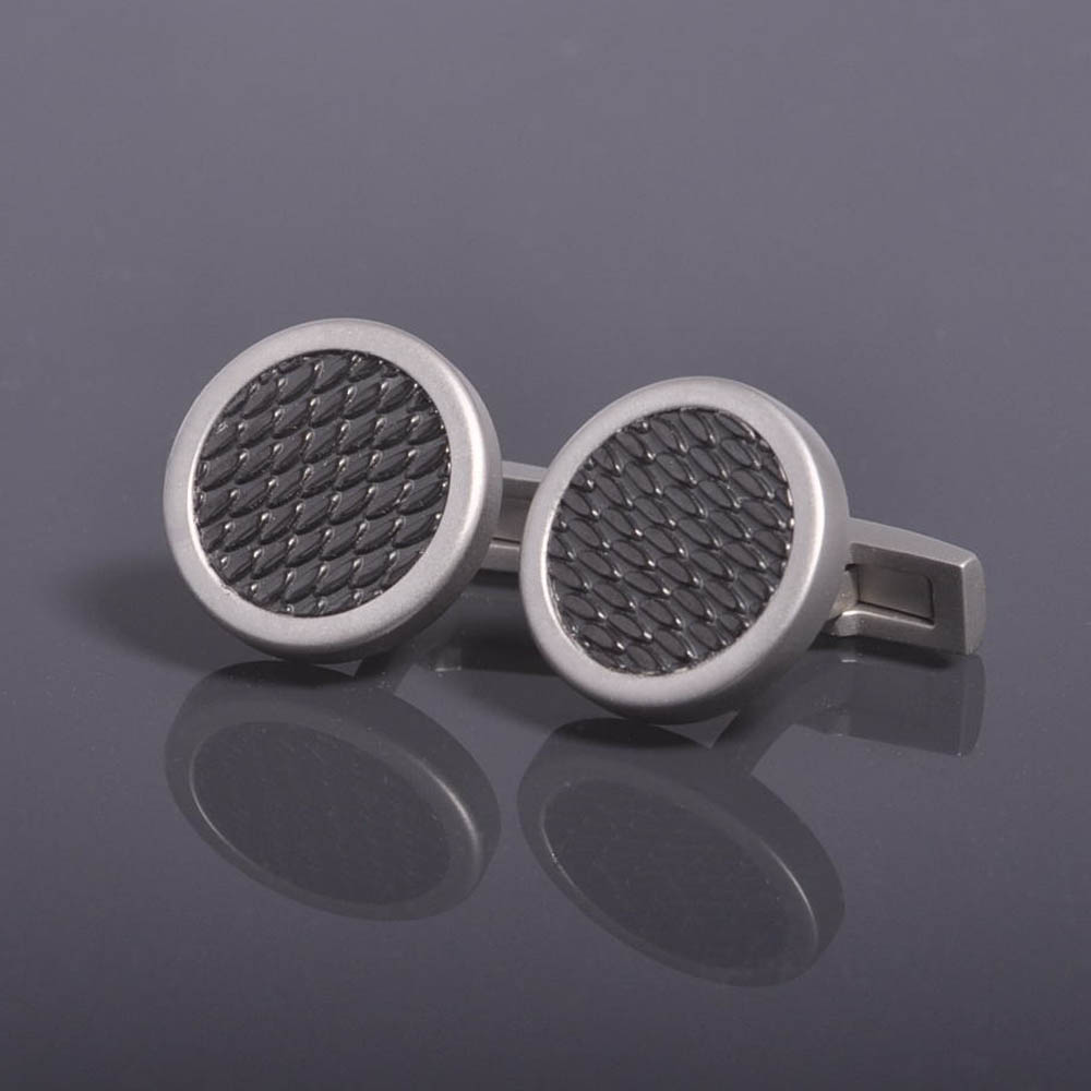Deze moderne manchetknopen met raster techniek zijn in meerdere kleuren leverbaar. Ze zijn geheel gemaakt van edelstaal en zijn deels gekleurd volgens een PVD techniek. De ronde knoop heeft een diameter van 19 mm.