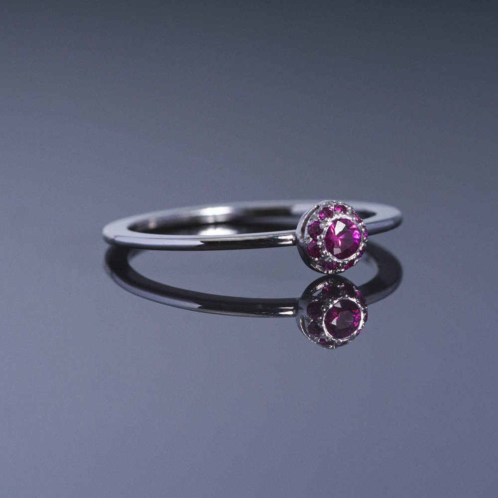 De ring op de foto is gemaakt van witgoud. In de ring zijn 10 robijnen gezet. De ring is gemaakt op maat 18.25. Deze ring past goed naast de andere aanschuifringen die in de webshop staan zoals bijvoorbeeld de Optical Gems of de boomschorsringen.