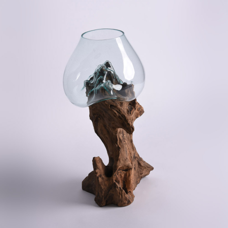 Druipende vaas van glas en teakhout (40 x 50 x 40 cm)